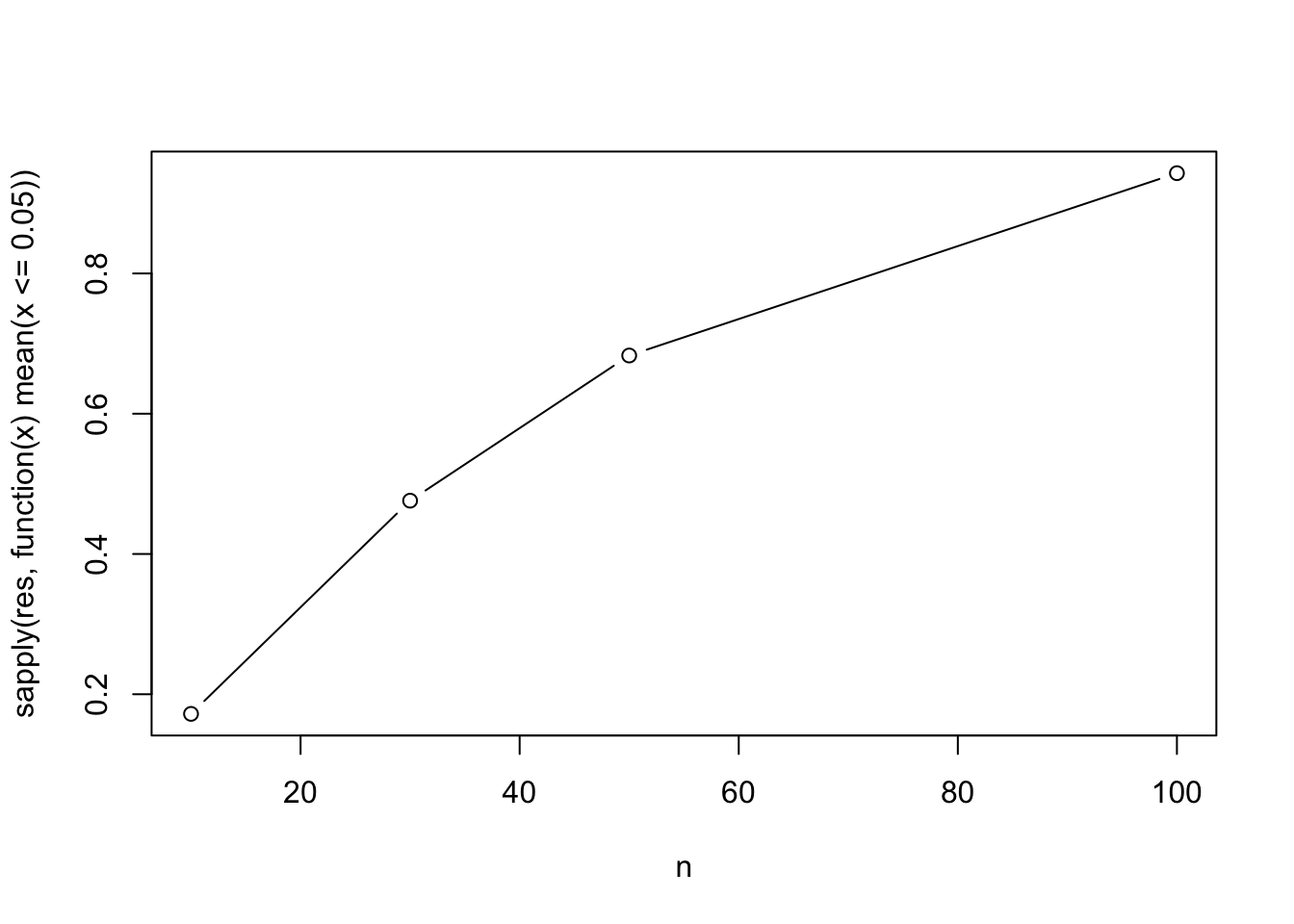 plot(n, sapply(res, function(x) mean(x <= 0.05)), type = "b")