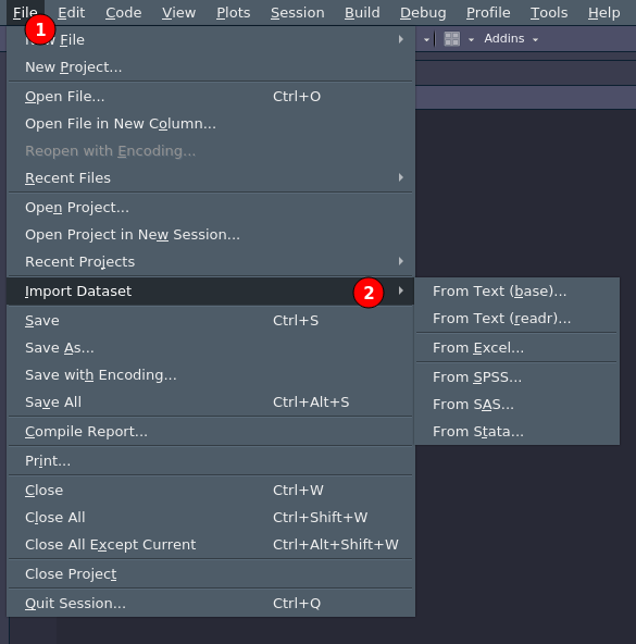 RStudio permette di importare qualsiasi tipo di dato tramite interfaccia grafica. All’inizio può essere utile ma quando si lavora all’interno di uno script è meglio automatizzare tramite comandi qualsiasi operazione sia per salvare che per importare i dati. Potete trovare il menù di importazione con file >. import dataset come in Figura Figura.