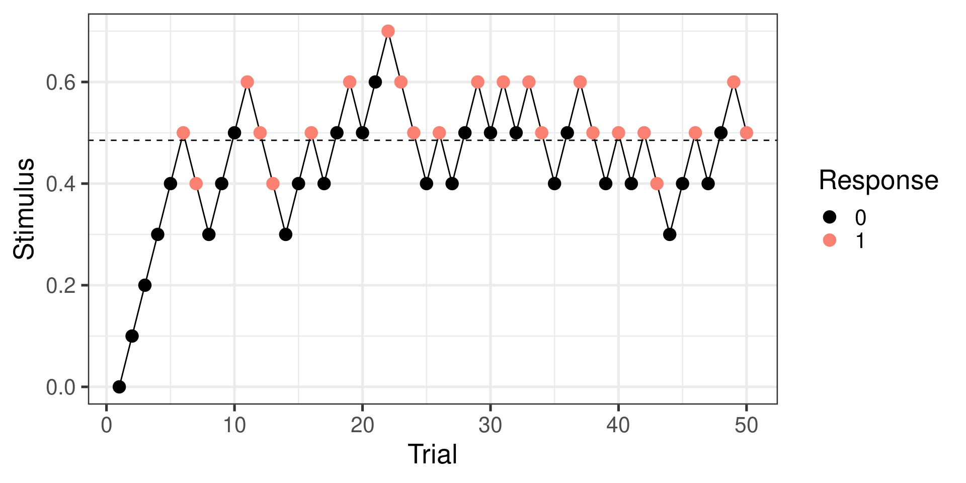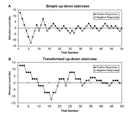 La procedura, detta staircase adatta la difficoltà dell’esperimento per tenere l’accuratezza al 50% (o altri valori)