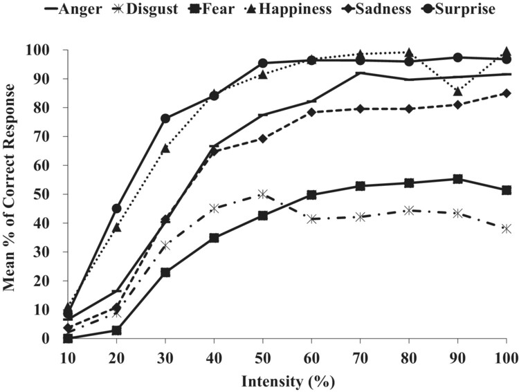 Mentre alcuni effetti sono noti in letteratura (alcune emozioni sono più facili da riconoscere) possiamo essere interessati a vedere se la relazione tra intensità ed accuratezza cambia in funzione dell’emozione (interazione):