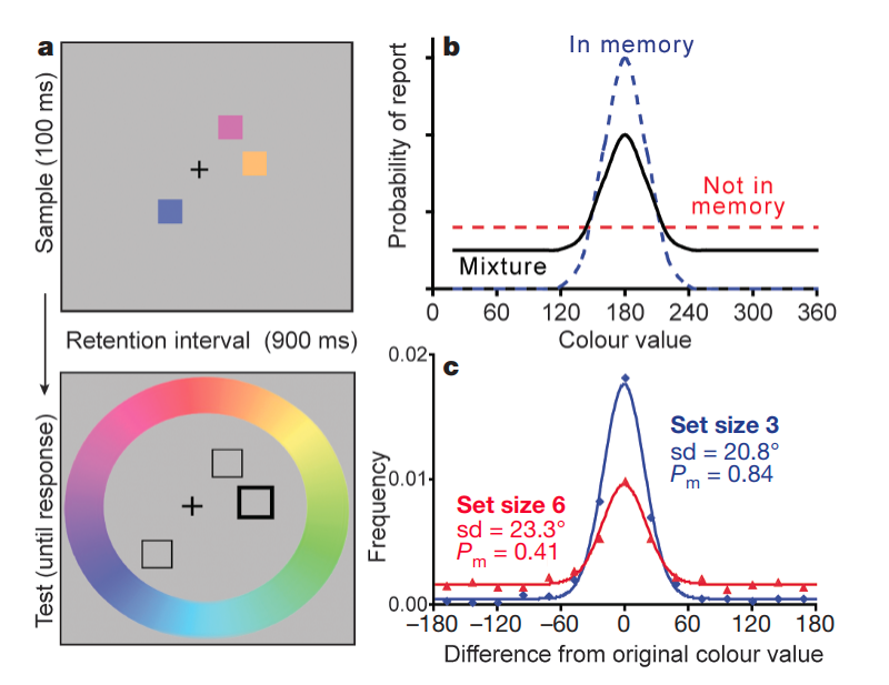 Questo compito è utilizzato per stimare la capacità della memoria visiva a breve termine. Possiamo vedere un esempio pratico a questo link https://run.pavlovia.org/demos/change_detection/.